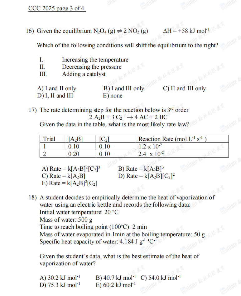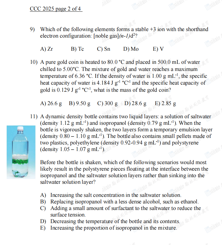 CCC竞赛面向全球9-12年级高中生,特别是9-10年级学生作为化学竞赛的入门选择。它采用全英文选择题形式,要求在60分钟内完成25道题目,满分100分。这种“答对得分,答错不扣分”的机制大大降低了参赛者的心理压力,成为中国赛区学生的显著优势。